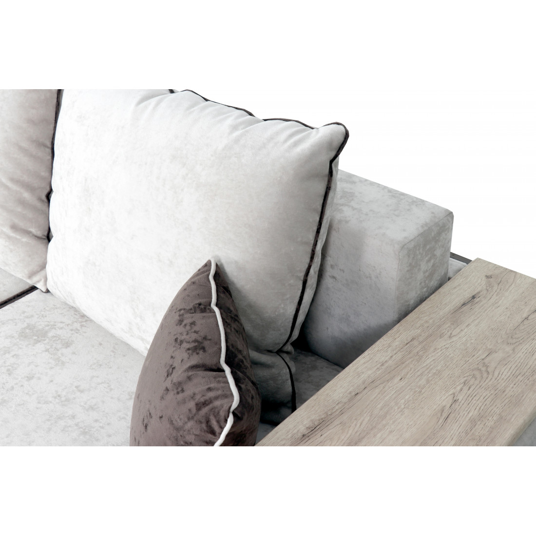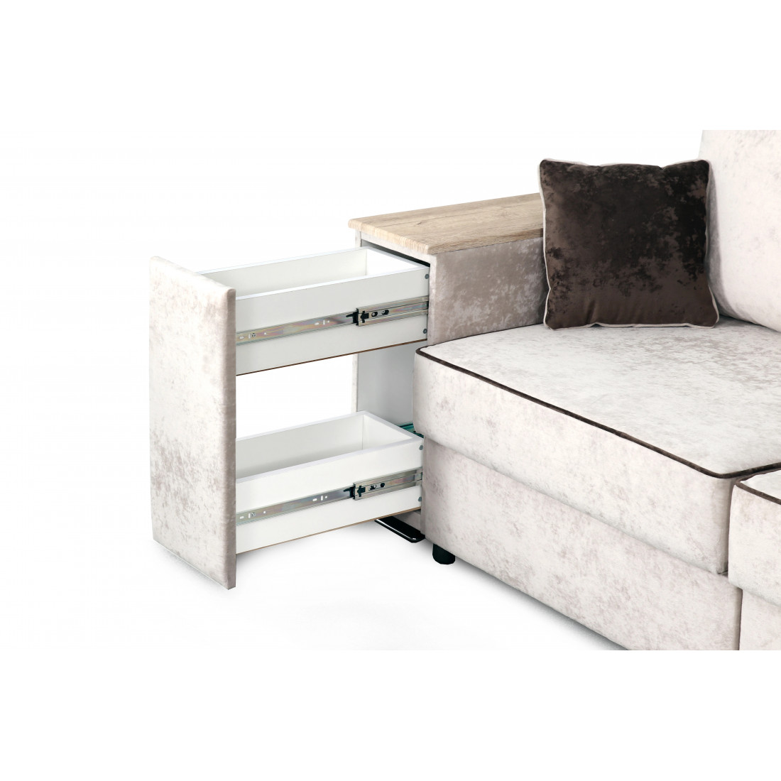 С одной стороны расположена боковина с нишей, с другой – ящики. Надежные петли с доводчиками добавляют комфортности использования мебели. Диван-трансформер может быть прямым, угловым и П-образным. Малые декоративные подушки входят в комплект дивана.
