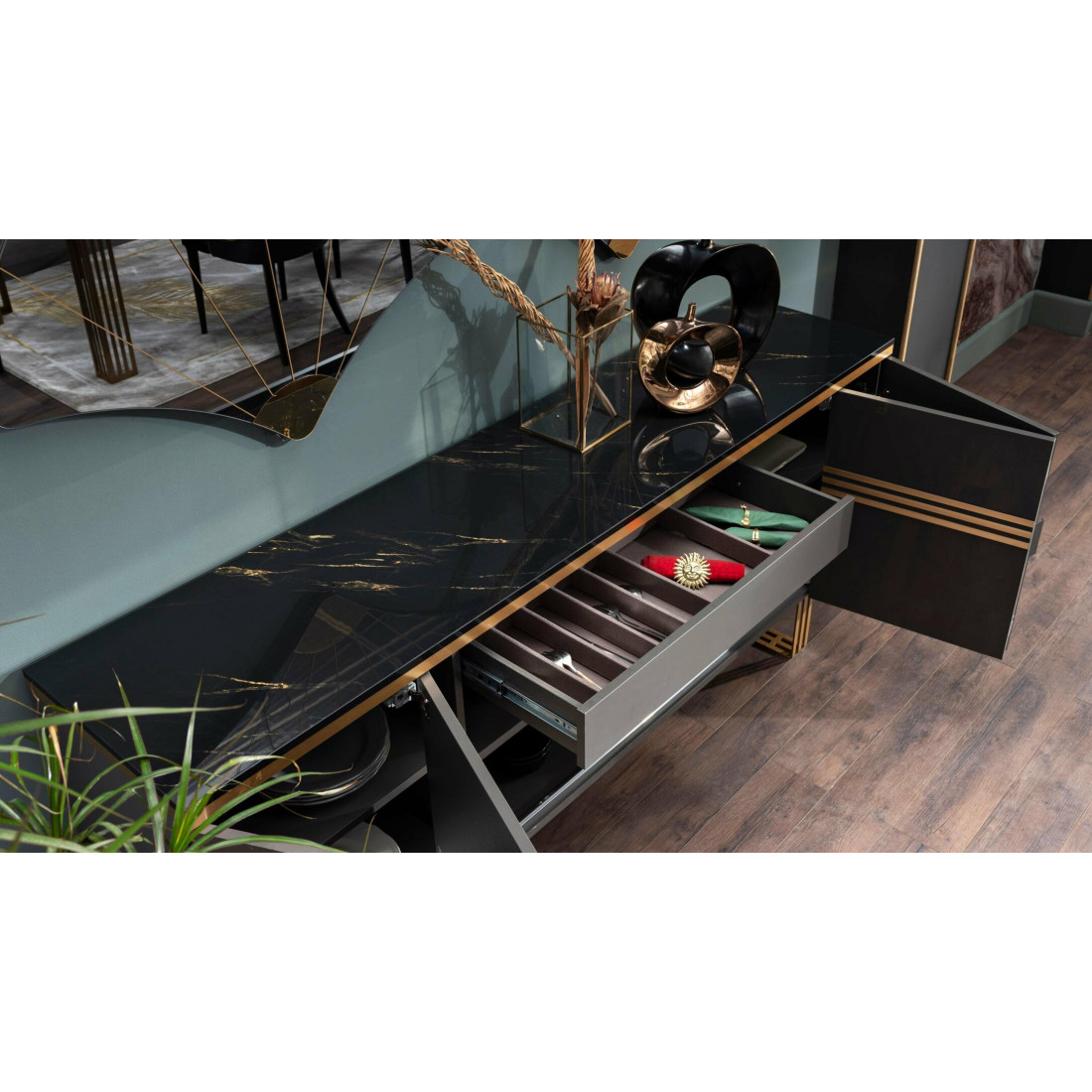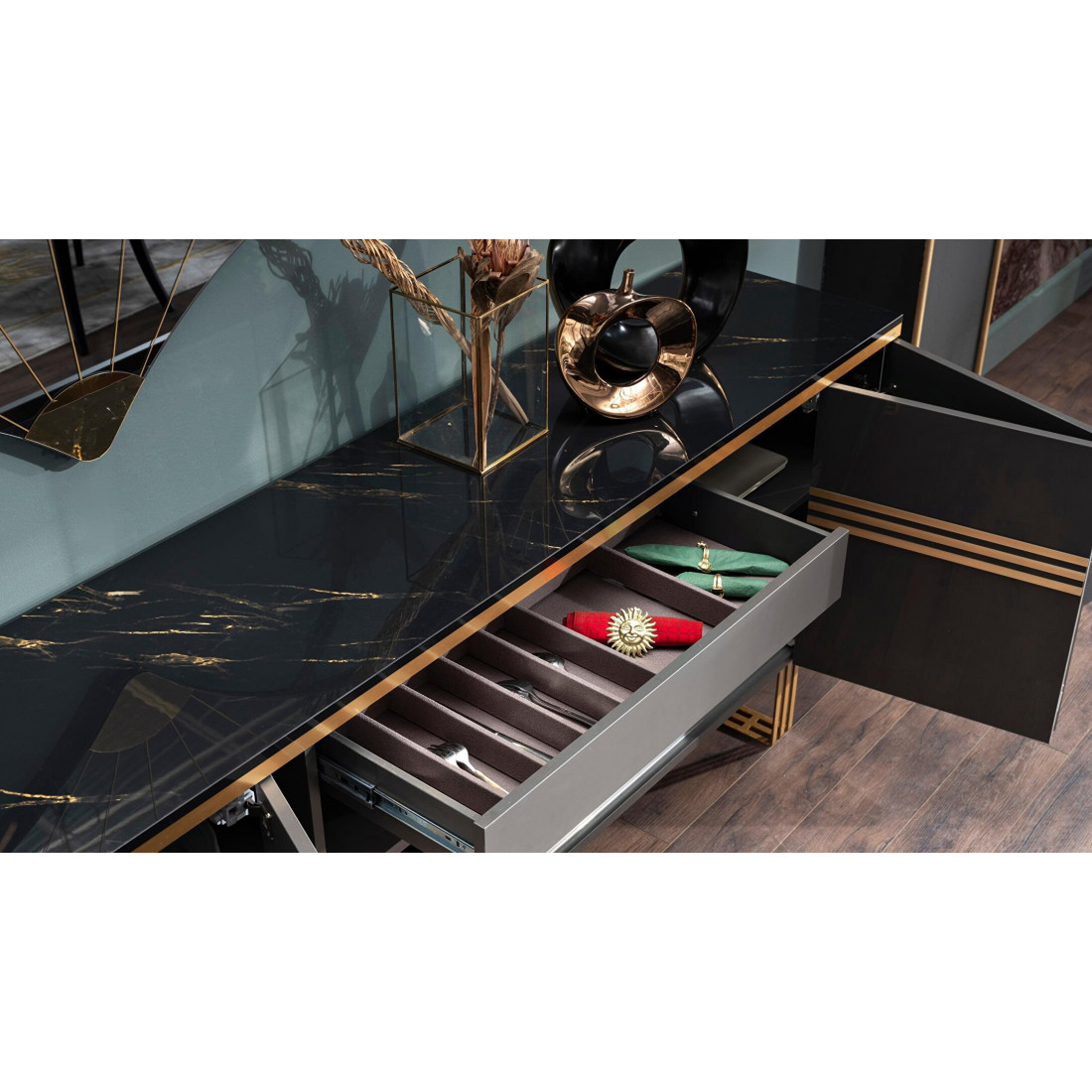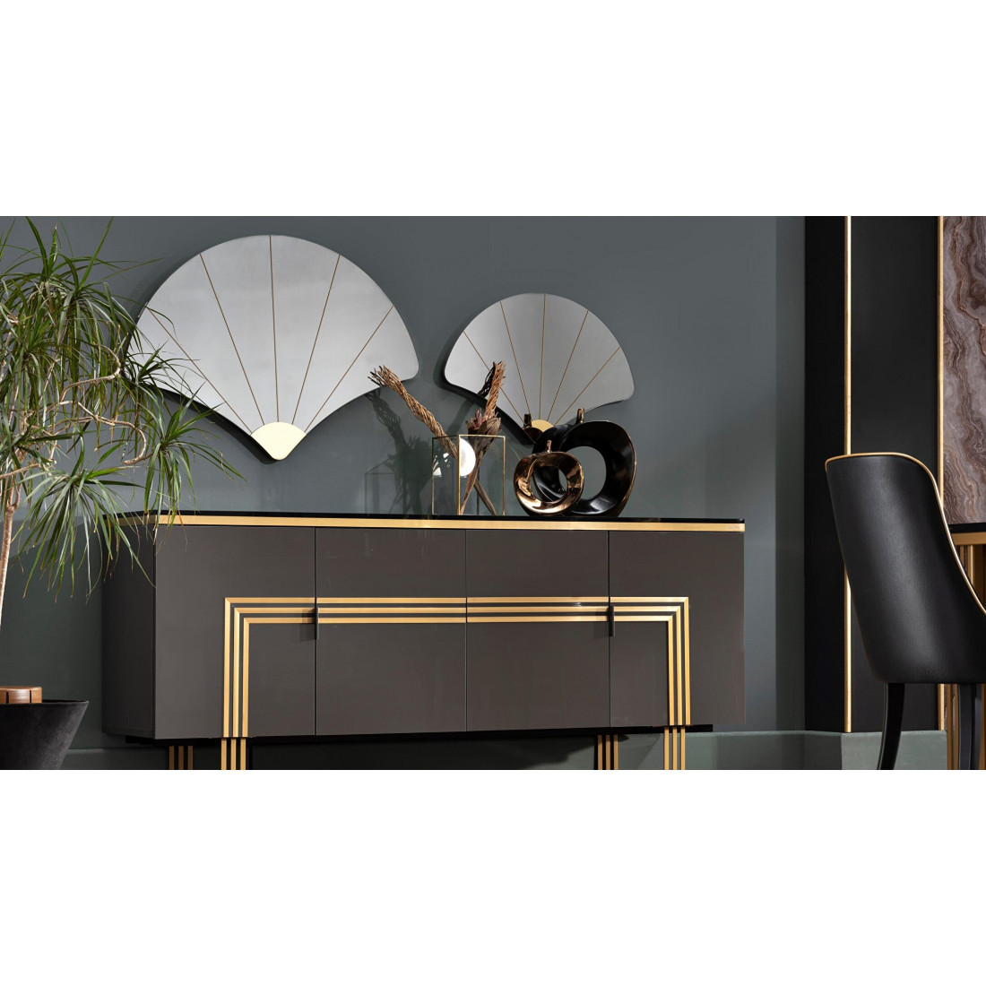 Длинный комод-буфет в гостиную Carlino CARL-10 выполнен в современном стиле Арт Деко. Его можно использовать как для хранения посуды, так и для хранения вещей. Оригинальный дизайн, комбинация фасадов цвета антрацит с золотой отделкой, необыкновенные по стилю металлические ножки -все это притягивает взгляд и не оставляет никого равнодушным. Комод длиной 2000мм , при относительно небольшой глубине 450мм прекрасно впишется в интерьер гостиной, столовой, спальни.За дверцами центральной части комода спрятан многофункиональный выдвижной ящик. Дверцы комода плавно закрываются. Глянцевая столешница черного цвета имеет золотистые мраморные разводы и отделана по контуру 3d кромкой.И как завершение композиции, дополнительный элемент комода -это комлпект из двух веерообразных зеркал Карлино CARL-24.