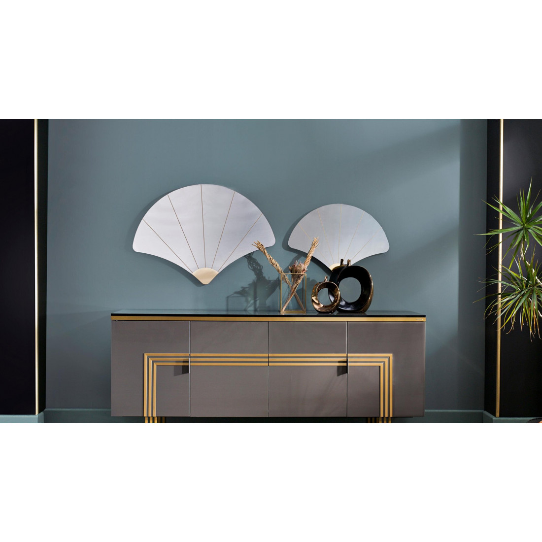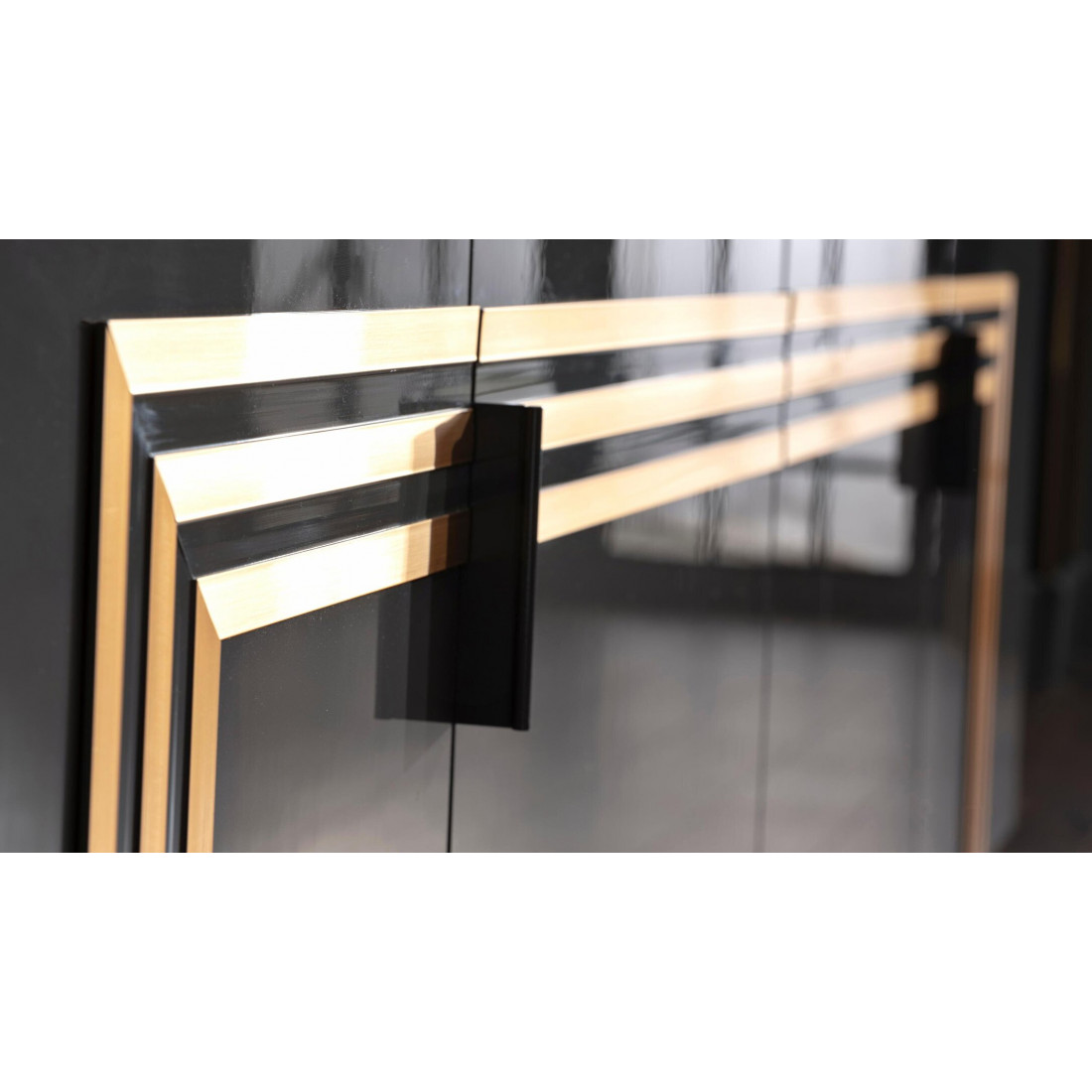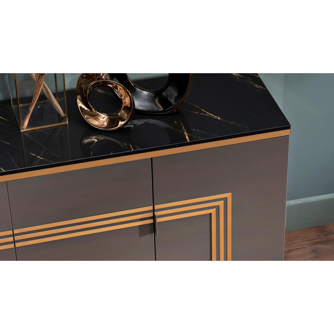 Длинный комод-буфет в гостиную Carlino CARL-10 выполнен в современном стиле Арт Деко. Его можно использовать как для хранения посуды, так и для хранения вещей. Оригинальный дизайн, комбинация фасадов цвета антрацит с золотой отделкой, необыкновенные по стилю металлические ножки -все это притягивает взгляд и не оставляет никого равнодушным. Комод длиной 2000мм , при относительно небольшой глубине 450мм прекрасно впишется в интерьер гостиной, столовой, спальни.За дверцами центральной части комода спрятан многофункиональный выдвижной ящик. Дверцы комода плавно закрываются. Глянцевая столешница черного цвета имеет золотистые мраморные разводы и отделана по контуру 3d кромкой.И как завершение композиции, дополнительный элемент комода -это комлпект из двух веерообразных зеркал Карлино CARL-24.