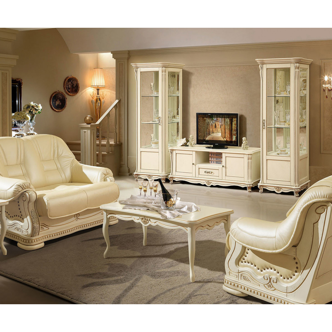 Грациозность этой программы особенно проявляется в крашении «слоновая кость с золочением». Роскошная, но при этом утонченная программа «Алези» создана для приверженцев современной уютной неоклассики. Важно, что вся внешняя эстетичность продумана не в ущерб функциональности. В наборе представлены самые необходимые для гостиной элементы: вместительные шкафы, письменный стол, тумба под телевизор с местом для хранения.
