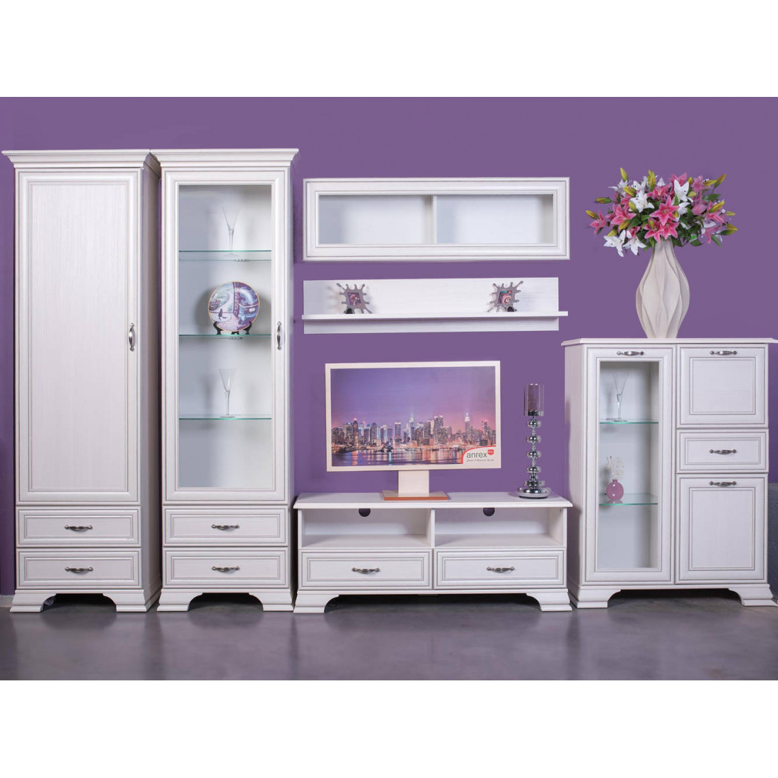 Гостиная Тиффани - это классика, которая всегда остается модной и стильной. Сочетание светлого оттенка с древесной структурой, нежных фасадов, обрамленных изящными планками с патиной и качественных металлических ручек создадут атмосферу тепла и уюта, а возможность использования подсветки делает эту коллекцию особенно привлекательной. Основное достоинство TIFFANY - эстетическая функциональность, которая роскошно дополнит различный по назначению интерьер.