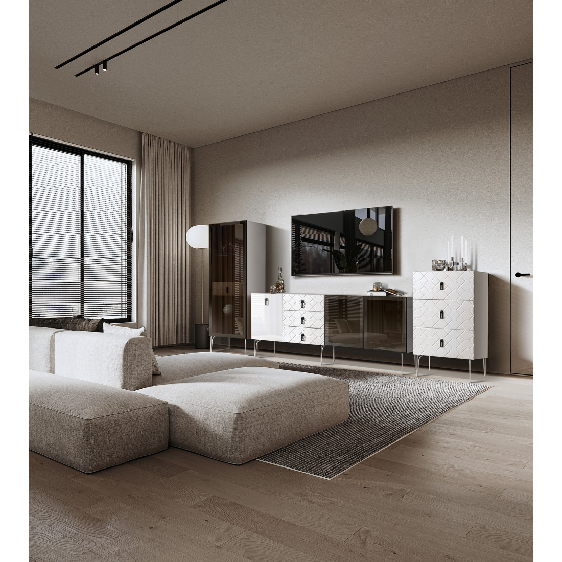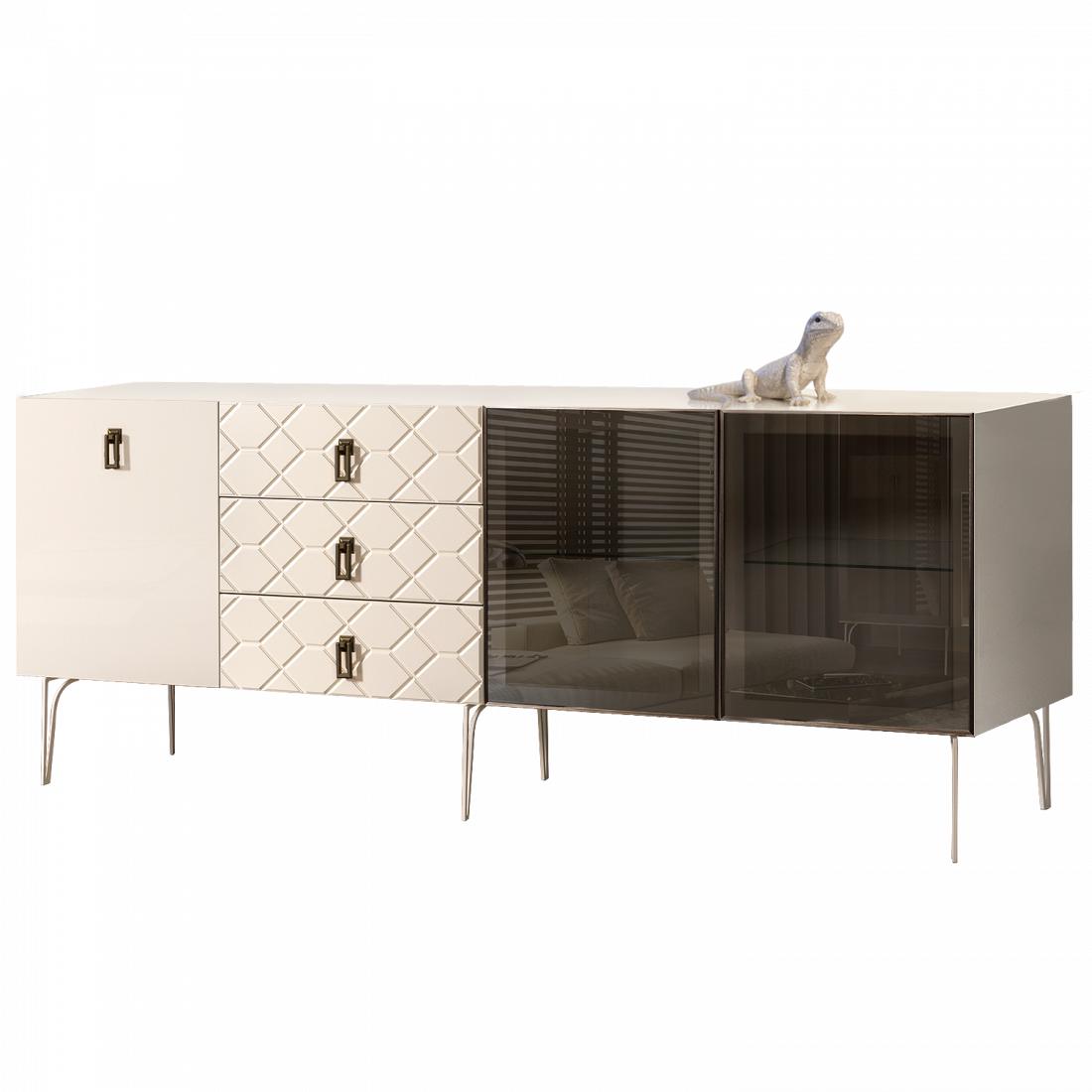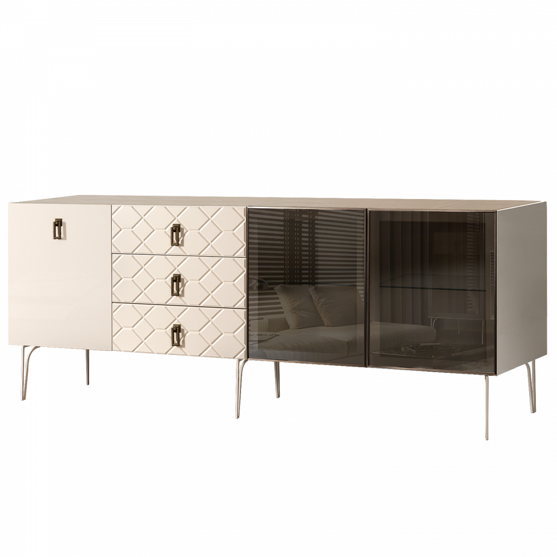 Стекло Stopsol меняет свои отражающие свойства под воздействием источников света. Поверхность, отражающая свет, мягко скроет содержимое вашего комода или витрины.