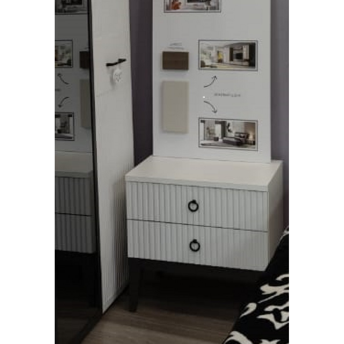 -Фасады ящиков выполнены из МДФ с декоративной фрезеровкой в виде вертикальных полос и окутаны плёнкой