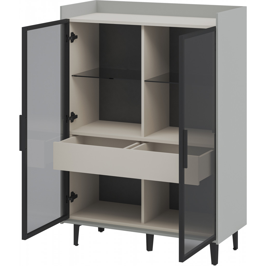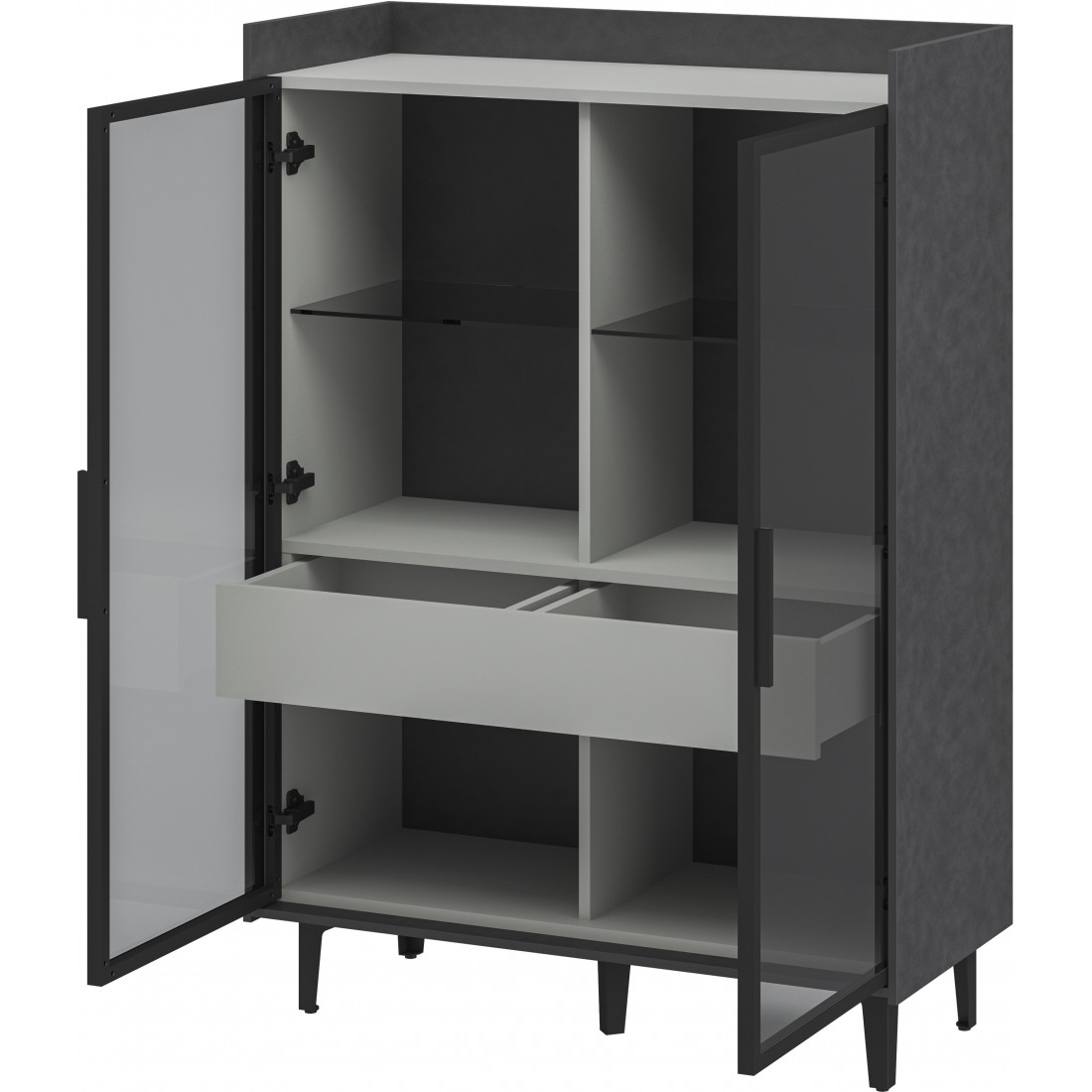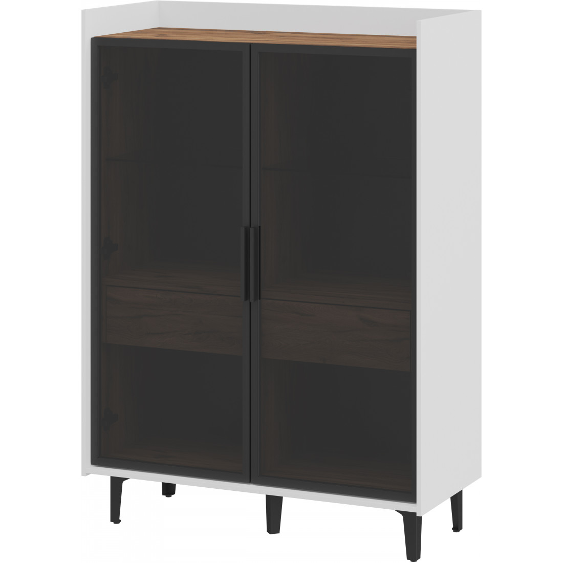Компактный шкаф Модена представляет уникальное решение для небольших гостиных. Выберите из трех стильных вариантов цветов: Белый-Дуб Элисон, Лунный камень-жемчуг, Металл Бруклин-лунный жемчуг. Металлические ножки гармонично дополняют дизайн, обеспечивая стабильность. Темное стекло придает шкафу загадочность. Два отделения с элегантными стеклянными полками и фасадами создают легкость и визуальное пространство, а между ними расположен удобный ящик для хранения мелочей. Шкаф Модена — идеальное решение для организации пространства в небольших гостиных с учетом стиля и функциональности