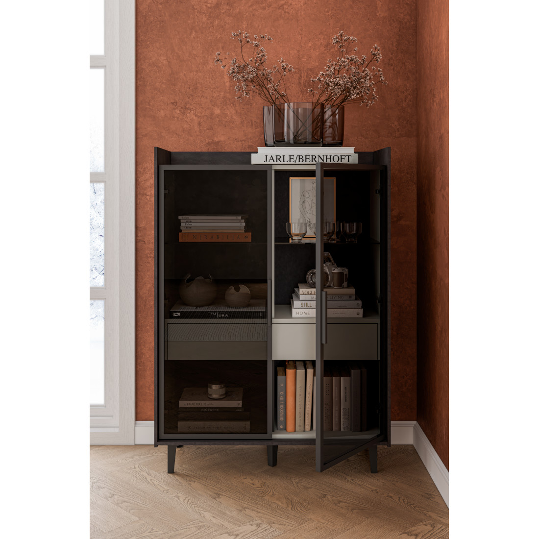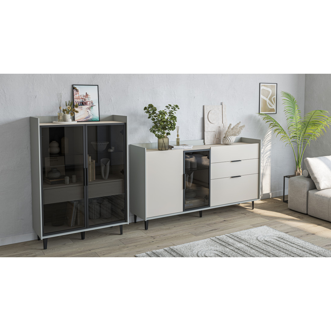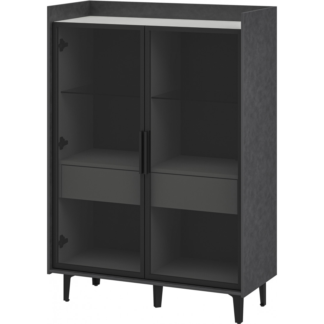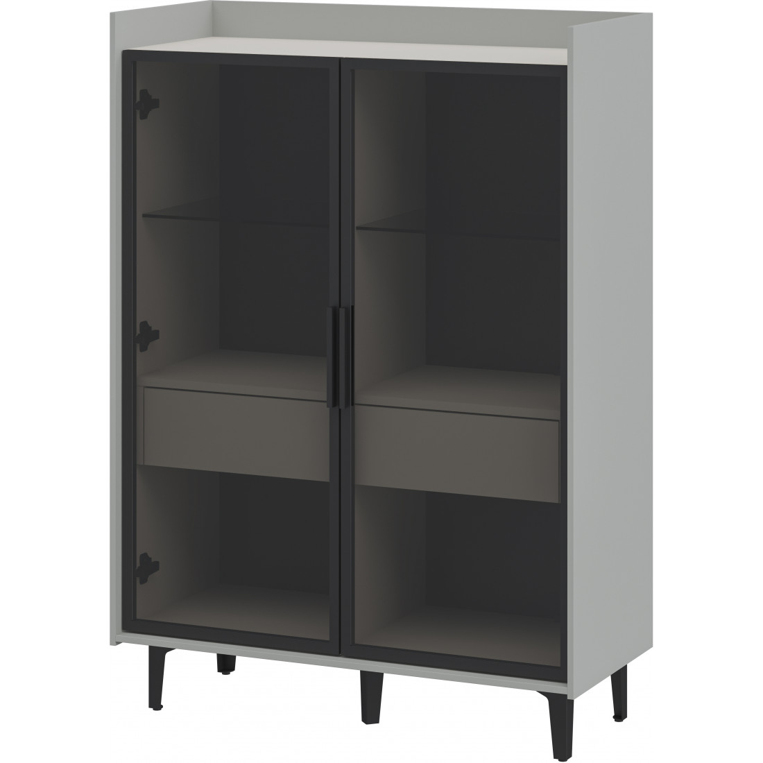 Компактный шкаф Модена представляет уникальное решение для небольших гостиных. Выберите из трех стильных вариантов цветов: Белый-Дуб Элисон, Лунный камень-жемчуг, Металл Бруклин-лунный жемчуг. Металлические ножки гармонично дополняют дизайн, обеспечивая стабильность. Темное стекло придает шкафу загадочность. Два отделения с элегантными стеклянными полками и фасадами создают легкость и визуальное пространство, а между ними расположен удобный ящик для хранения мелочей. Шкаф Модена — идеальное решение для организации пространства в небольших гостиных с учетом стиля и функциональности