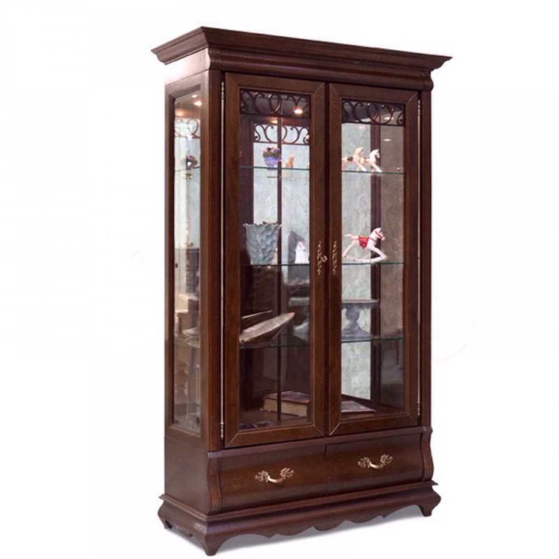 Классический двухдверный шкаф со стеклянными витринами из коллекции мебели "Оскар" это гармония изогнутых форм и стекла. Стеклянные дверцы с фацетом декорированы ажурной резьбой с растительным орнаментом. Фасад выполнен из массива дуба. Модель окрашена в оттенок "Орех".