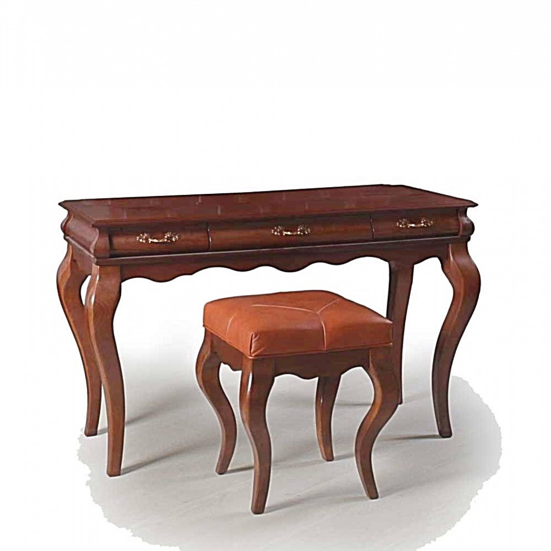 Изящный туалетный столик продолжает модельный ряд коллекции мебели для спальни "Оскар". Столик декорирован изогнутыми ножками и удачно сочетающейся с ними нижней кромкой в форме волны. Выдвижные ящики на направляющих бесшумного выдвижения, дно выложено велюром. Фасад сделан из массива дуба, окрашен в оттенок "Орех".