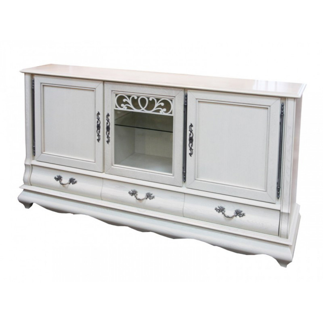Классическая трехдверная тумба с выдвижными ящиками из коллекции "Оскар". Декорирована изящной резьбой и фурнитурой. Создана из массива дуба и окрашена в оттенок "Белая эмаль с патиной".